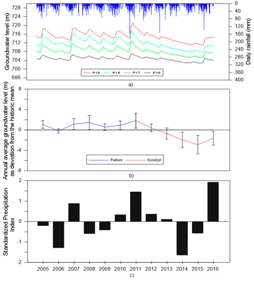 The groundwater levels measured in the monitoring wells from the hydrological year 2005 to 2016 are shown in Figure 5. The monitoring well data have a well-defined annual cycle with the maximum water table at the end of the rainy period and a single peak throughout the year during the 2005–2011 period (Figure 5). After changing the land use from pasture to Eucalyptus, a significant reduction of annual peaks in groundwater levels was observed. The decrease in groundwater levels peak was pronounced during the 2012 and 2013 year, to which annual rainfall was close to the long-term mean (1504 mm). Additionally, 2012 (SPI = 0.36) and 2013 (SPI = 0.11) were classified as regular years in terms of the rainfall amount (Figure 5c).