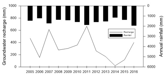 Figure 6 shows the annual groundwater recharge estimated using the WTF method. The mean ± standard deviation of the recharge was close to 318 ± 77 mm over the 12-year study period. The uncertainty corresponds to a value of 24% of the mean annual recharge, which is consistent with previous studies [23,24,50]. Before the Eucalyptus afforestation, the highest recharge value (667 mm) was estimated in 2011 (Figure 6), corresponding to about 36% of the annual rainfall (1862 mm). The lowest recharge value (155 mm) (Figure 6), equivalent to almost 13% of the annual rainfall (1209 mm), was observed in 2006 when the lowest rainfall during the pasture period was recorded.