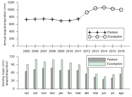 where Kc (-) is a coefficient for the crop. To estimate ET in the pasture period, a mean Kc value of 0.60 was used [45]. For the period covered by Eucalyptus plantation, we adopted Kc = 0.70 in the first year and Kc = 0.82 in the following years [46]. The former authors estimated the Kc for Eucalyptus grandis and hybrid Eucalyptus (Eucalyptus grandis × Eucalyptus urophylla), considering two crop growing stages: The initial growth phase (until the first 18 months) (Kc = 0.70) and the middle growth phase (after 18 months) (Kc = 0.82).