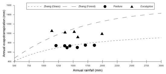 Annual evapotranspiration estimated for Eucalyptus plantation and pasture compared to the relationships presented by [51].