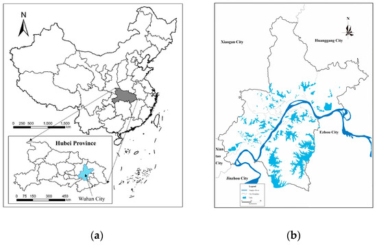 Wuhan city is located in East longitude 113°41′–115°05′ and North latitude 22°29′–31°58′, in the East of Jianghan Plain and in the middle reach of Yangtze River. It is the capital city of Hubei Province (Figure 1a), with a total land area of 8494.41 km2 [23].