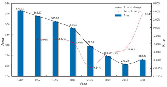 The total area of lakes in Wuhan’s urban development area (1987–2018). The comparison of the statistical data of lake area every four years indicates that the overall lake area initially decreased year by year and then slightly increased. The total area changed from 376.52 km2 in 1987 to 282.43 km2 in 2018, decreasing by 94.09 km2 in 30 years.