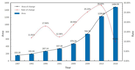 The method described in Section 2.2.3 was adopted to extract the urban built-up areas of Wuhan urban development area in each period, and the results are shown in Figure 5. On the basis of the data in the analysis chart, the built-up areas of Wuhan increased from 153.35 km2 in 1987 to 1484.59 km2 in 2018, indicating a significant urban expansion. The Wuhan built-up areas increased, decreased and then increased again, which is the same as the logistic growth model and can be divided into three stages as follows.