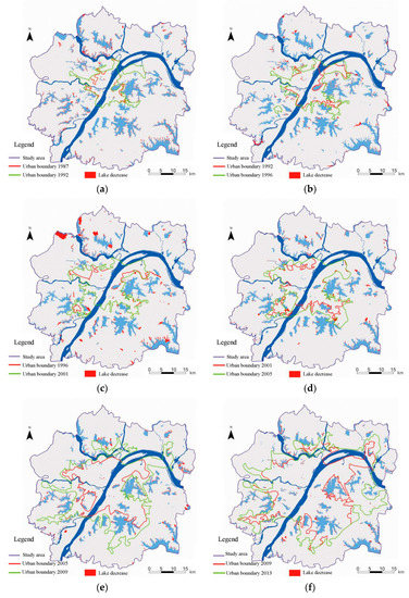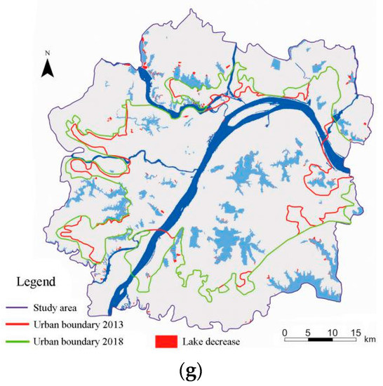 Urban expansion and lake changes in Wuhan urban development area from 1987–2018. (a) 1987–1992; (b) 1992–1996; (c) 1996–2001;(d) 2001–2005; (e) 2005–2009; (f) 2009–2013; (g) 2013–2018.