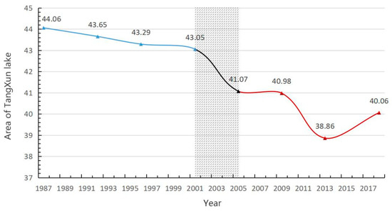 Changes in the water area of Tangxun Lake (1987–2018). In the figure, blue, black and red respectively represent three stages of lake area change of Tangxun Lake.