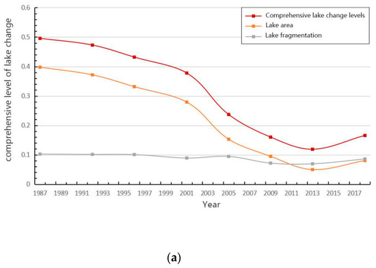 Using the methods described in Section 2.3.3 and Section 2.3.4, the comprehensive levels of lake change and urban expansion from 1987–2018 were evaluated, the results were shown in Figure 8a,b, respectively.