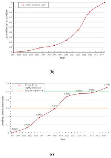 Then the method described in Section 2.3.5 was adopted to calculate the coupling degree between built-up area and lake evolution of Wuhan development area, and the results are shown in Figure 8c.