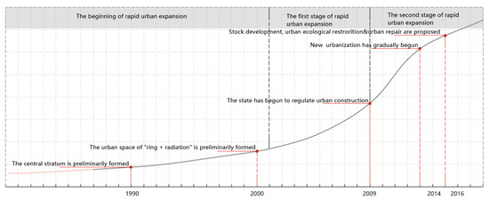 Wuhan built-up areas also experienced different improvement periods in the development process of modern times, which were significantly influenced by urban policies (Figure 10). From 1979–1990, the city expanded rapidly. At this time, the ancient city wall of Wuchang was completely dismantled; industrial projects gave birth to a large number of units and industrial living areas; and the Wuchang-Zhongbei and Hankou-Wushang business circles were formed during this period. By 2000, the modern service industry gathered and developed in the central area of Wuhan; Guanggu and Zhuankou economic and technological development zones were taking shape; and the city has been expanded from the central urban area to the new urban area. Since the beginning of the new century, urban expansion of Wuhan has been accelerating, the central city was fully urbanised, the “ring + radiation” urban space structure was formed and the rail transit system supported the rapid development of the city. After 2000, Wuhan City vigorously promoted the development of urban and rural integration. With the rapid advancement of urbanisation and the increasingly rapid development of cities, a large amount of arable land has been converted into urban construction land, and the wave of real estate development has gradually begun. Around 2009, the government began to regulate the real estate industry, and the urban expansion rate began to drop gradually. Around 2014, Wuhan began a new type of urbanization, its urban pattern was basically formed and the rate of urban expansion slowed down further. With the gradual introduction of various urban policies, such as stock planning, urban renewal and Ecological Restoration, Urban Repair, urban development will gradually become more sustainable in the future.