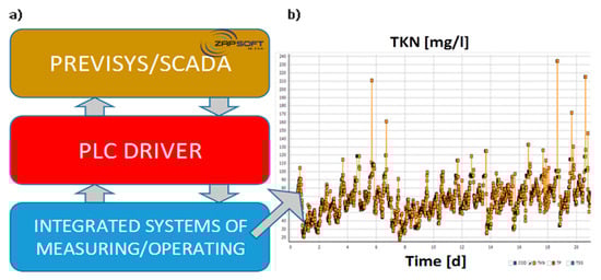 Figure 1. The architecture technology process scheme (a) with the measuring/operating PreviSys communication system and (b) sample results of the key parameters display (COD, TSS, TP and TKN data were shown) relating to the quality of the wastewater inflow for the operation/control of the “Klimzowiec” WWTP. - ▪