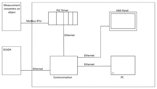 Fully equipped PreviSys might be divided into three parts: PreviBox, PreviSoft and PreviSCADA. The PreviSCADA software installed on an industrial PC called PreviBox could be implemented with several modules: communication, database, alerting, reporting, visualization, web server, etc. PreviBox is a device that could work together with the automation systems of WWTP or could even replace it. PLC modules consisted of PreviBox (with a touch panel, industrial PC, router and switch) suitable for communication with other devices at the WWTP. The results of the MMCS could be used by the SCADA system for proper control of the individual devices (blowers, pumps, internal recalculation, DO concentration, etc.). In order to control the aeration blower by using the model for simulating the NH4 concentration at the outlet of the bioreactor, it was assumed that every 15 minutes, online data are collected and then added to the set of input data and processed in mathematical model in order to generate the results of NO3, NH4 virtualization, etc. The actual result of the computer simulation could be sent back to the SCADA system which is responsible for the adequate control and operational strategy of the aeration system, which was tested during this study in the “Klimzowiec” WWTP (Figure 2).