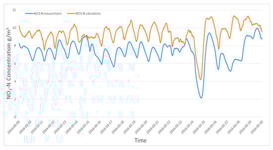 One of the reasons that ASCS has still been limited in practical use could be the lack of a proper approach and procedures to simulate biochemical processes. The optimization based on the physiology of ASM will be the next level of system operations, which are required to use advanced tools (such as, e.g., MATLAB®/Simulink®, C++ Generator) as well as additional support model calculations and/or sensitive analysis (SA) in order to minimize existing factors at the studied plant. The SA calculation gives a parameter significance ranking that could reduce the number of iterations required and the calibration process could be determined interactively [,,,]. In this study, ASM2d was calibrated using an identifiability method to describe the N and P removal in the “Haaren” and “Haarlem” WWTPs [,] as well as the “Debogorze” WWTP []. The data in Figure 4 were collected from a period of 21 days: 9 March 2016 to 30 March 2016. The results of the NO3-N data which have been derived from the model predictions at the “Klimzowiec” WWTP were marked in orange, while the online NO3-N measurements data which were derived from the real sensor were marked in blue. Both results showed similar trends in the plant operation change. The biggest difference between the measurement data and model predictions occurring in the sixteenth day of the simulation, which was probably caused by the inflow of unusual pollutants to the WWTP. It caused the performance blowers to be insufficient to remove the entire load of NH4-N, which resulted in the setting the blowers to their maximum performance for the next 3 days (during the weekend). Further investigation on this specific aspect should be performed in the next set of studies in order to find potential threats and consequences to the long-term virtual sensors’ (e.g., NO3-N, NH4-N) application as well as MMCS for obtaining more stable and predictive conditions at the biological part of the WWTP.