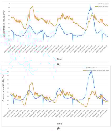 The comparison between (a) the measured versus calculated “virtual” NH4-N data by model predictions at the “Klimzowiec” WWTP (b) the measured NH4-N results reducing the values by 0.3 mg/L compared to model predictions.