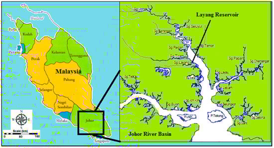 In this research, the Layang Reservoir was selected as the case study area for the proposed prediction model of evaporation rate. The main reason for selecting this area was because of the availability of daily hydrological and meteorological data covering a relatively long time period. In addition, there is a need for an accurate reservoir simulation model for the Layang Reservoir because it is considered to be one of the most important control points on the Layang River. In fact, the Layang River is the major tributary for the Johor River, which is the major water resource in Johor state. The Layang River Basin is located approximately within 01°30′ N and 01°36′ N latitudes and 103°50′ E and 104°00′ E longitudes, and the altitude range of the whole river basin is between a minimum of 30 m and a maximum of 60 m above sea level. The Layang Reservoir is located in the Johor River Basin in the southern region of Peninsular Malaysia, as shown in Figure 1.
