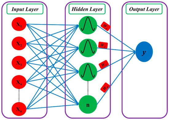 In this work, we used RBF-NN, which is the most popular type of ANN and has been used in several types of research. The reason for the popularity of RBF-NN is its simple and successful application in prediction studies. RBF-NN has three layers. The first layer is the input layer, which comprises several neurons based on the number of input variables and has an unlimited number of input parameters. The second layer is a hidden layer, which has a radial basis activation function inside its neurons. The third layer is also a hidden layer that generally has one neuron in one forecasting output. Figure 2 presents an example of the RBF-NN architecture.
