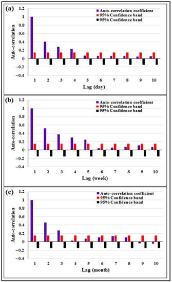 The first scenario was developed considering only the historical records of the pan evaporation rate. The selection of the input data records was based on how the antecedent records were correlated with the predicted output value. The autocorrelation analysis for the historical daily, weekly, and monthly time series for the pan evaporation rate was carried out as shown in Figure 3. With the help of the correlation analysis for the time series, the effect of how the preceding values of certain variables could stimulate the current value of the same variable could be measured. In addition, the correlation analysis could provide a good indicator of how sensitive the relation is. In this context, the autocorrelation analysis was functionalized for the historical evaporation rate data for different lag times ranging from 0 to 10.