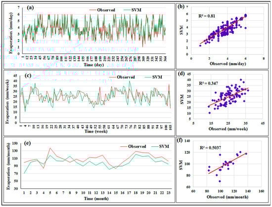 It is useful to present the distribution of the evaporation data which was predicted by the proposed models around a fit line. The pattern of the predicted data obtained by SVR versus actual evaporation is presented in Figure 4: (a) daily, (c) weekly, and (e) monthly. It can be seen that the suggested predictive model (i.e., SVR) was better with daily data at detecting the actual data than the other timescales. The scatterplots for the best models under the three timescales employing SVR are also shown in Figure 4. It is noticeable that the correlation between predicted and actual data with daily records was higher than the weekly and monthly timescales.
