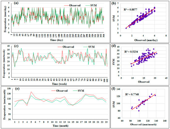The patterns of the predicted data obtained by the architecture of the SVM models which led to the best results using different timescales are shown in Figure 6. These patterns demonstrate the flexibility and capability of SVR for mapping and predicting linear or nonlinear functions when using daily data. The scatterplots of the best model under the three timescales are also presented in Figure 6. It is observed that the SVM provided poor matching between the predicted and actual evaporation data using weekly records. The suggested method (i.e., SVM) was highly capable of predicting the evaporation values, which were less than 4 mm/day (Figure 6b). Finally, a high correlation magnitude was attained by employing daily evaporation data for modeling.