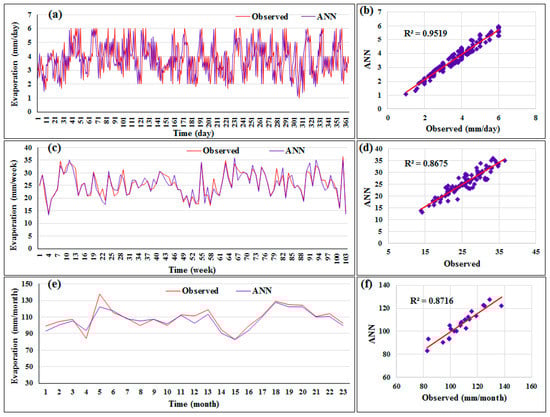 Figure 7 shows the distribution of the evaporation data predicted by the best model among all timescales (daily, weekly, and monthly). As seen in Figure 7a, the predicted and actual evaporation data converged, with the exception of some peak values. The performance of the proposed method with monthly data was slightly better than with weekly records. It was found that the correlation coefficient by the ANN method was 0.95. This magnitude of correlation was an adequate achievement in terms of the usability of the suggested model in predicting evaporation data in situations where indirect or direct methods cannot be used. The figures show that there was fairly good agreement between the predicted and actual data when using daily timescale data. Additionally, the improvement in the performance of the suggested method was attained with daily evaporation data. This demonstrates the ability of the ANN method to detect patterns in time-series data when using a lower timescale.