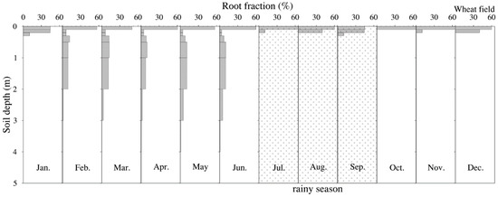 Monthly observed roots (biomass) of winter wheat in each soil layer (%) at different depths (m) (without roots under the 5 m depth).