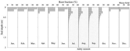 In the original version of CLM, the root system is described as the percentage of roots (biomass or root length density) distributed in each soil layer that does not change over the growing season. It is calculated with the two-parameter exponential function of soil depth (d) for 15 vegetation types [12,13,31]. Although the two parameters vary with the vegetation types, their root systems are mainly distributed in the soil zone <1.5 m depth. Monthly root distribution was used for shallow-rooted winter wheat and summer maize to explore the impact of rooting depth and associated growth on groundwater recharge. Based on our on-site observations (Figure 2 and Figure 3), the maximum rooting depths of winter wheat and summer maize are, respectively, 5 and 2 m, which are both deeper than that (1.5 m) implemented in CLM. Moreover, the root system is mainly distributed above 2 m in these two crop fields for most of the year, accounting for >95% of the total (Figure 2 and Figure 3). Therefore, the difference in rooting depth is neglected between the winter wheat and summer maize fields.
