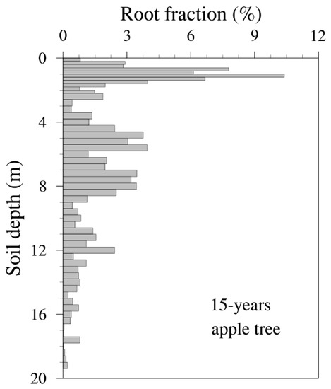 Root length density of 15-year-old apple trees in each soil layer (%) at different depths, as expressed by its bottom (m) (without roots under the 20 m depth).