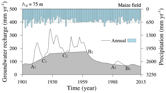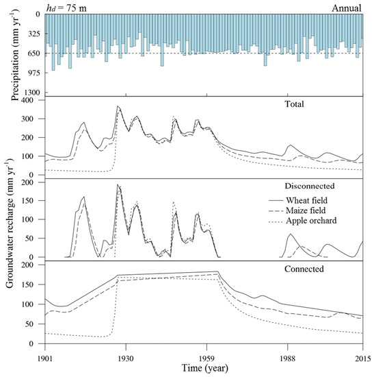 Rooting depth alters the amount of precipitation that is required to produce disconnected recharge and its ratio to total groundwater recharge. For disconnected recharge to occur, besides extreme precipitation, the antecedent soil must be wet enough. In the periods of 1901–1927 and 1964–2015, the annual precipitation that generated the disconnected recharge at 75 m depth was over 650 mm for the winter wheat field, 730 mm for the summer maize field, but none for the apple orchard (Figure 6 and Figure 7).