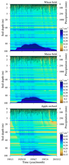 Figure 6 shows the vertical profiles of soil water content for the winter wheat field, summer maize field, and apple orchard from 1901 to 2015. The soil water content profile shows distinct horizontal bands, which are due to the stratified soil texture within the loess. Indeed, higher soil water content (horizontal blue bands) is associated with finer-textured inter-glacial paleosols, while lower soil water content (horizontal yellowish bands) occurs within the coarser-textured glacial loess layers (Figure 6).