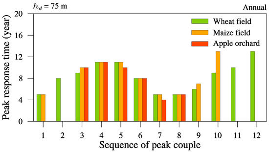 Response time of groundwater recharge peak at a soil depth (hd) of 75 m to extreme precipitation (with an annual amount >650 mm) for the wheat field, maize field, and apple orchard. Combined precipitation and recharge peaks with the same sequence number (Table 2) are referred to as peak couples, and the time interval between these two peaks is the response time.