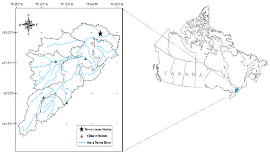 The South Nation Watershed (SNW) of about 4000 in Eastern Ontario was used as a showcase. It is characterized by multigauge climatic data (from St. Albert, Russell, Morrisburg, and South Mountains metrological stations) and downstream daily discharge data (collected at Plantagenet gauging station (ID: 02LB005)) (Figure 2). Hydrogeological investigations have indicated that an impermeable overburden watershed and a lack of streambed gradients in parts of the South Nation River pose a prominent flooding risk [26]. The average maximum and minimum air temperatures are 11.5 and 1.2 °C, respectively, with a mean annual precipitation of around 1000 mm. A more detailed description of the watershed has been presented previously [27].