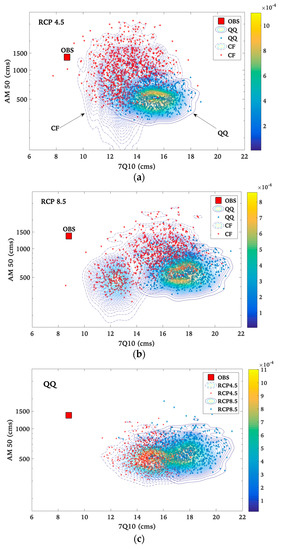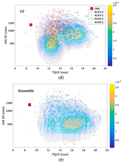 Bivariate kernel density estimations of the 50-year flooding event (AM 50) and the 7-day low flow of 10-year return period (7Q10) based on (a) RCP4.5 and (b) RCP8.5 scenarios, derived from ensembles of downscaled climate data using (c) QQ method, (d) CF method, and (e) the ensemble of all simulations. Each point represents a hydrological response to a climate-change realization (projection), and isolines represent their probability where isoline-values coded by color from yellow (higher intensity) to blue (less intensity). Results are compared to observed data (red square).