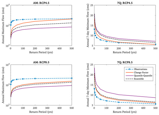 Estimations of future drought indices (7Q) and design floods (AM) based on RCP4.5 and RCP8.5 constructed from prolonged corrected climate time series, compared to observed and ensemble series.