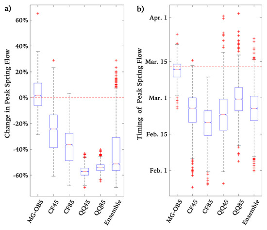 On the other hand, spring peak flow is generally a product of average air temperature and snowmelt runoff. Most of the ensemble data suggest an early occurrence of peak spring flow. This result is consistent with the finding of Gunawardhana and Kazama [72], who projected an early occurrence of peak spring flow in Italy by approximately 12 days during the 2080s in comparison to the baseline period. Also, it is supported by observed and projected changes in spring streamflow-timing across parts of western North America [81]. An advance in the timing of spring peak flow could negatively affect water supply, ecosystem, and reservoirs’ storage management [81]. However, such change in timing implies a reduction in snowmelt runoff severity (and hence the magnitude of the largest daily mean flows in spring), and the economic impacts will be apparent particularly in Canada [82]. These findings can likely explain the projected reduction in annual maxima values in a mainly snowmelt dominated river, where typically the highest flow occurs in early spring each year caused by snowmelt-generated runoff. These results are also consistent with previous works done in some Canadian watersheds that detected the same behaviour in the past such as Zhang et al. [83].