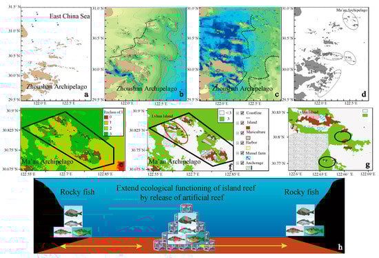 Adoption of MSP in the ECS follows the literature and practices on the appropriate frameworks. These frameworks have been successfully implemented, adopting a pre-existing set of procedures to suit the prevailing circumstances in the ECS. A step-by-step example is marine ranching MSP in the Zhoushan grounds (Figure 1). In 2011, Xu summarized the three major principles of marine ranching site selection in the ECS as: (1) clarifying the main purpose of site selection; (2) analyzing the main factors affecting selection (i.e., marine ecological environment, including abiotic and biotic factors; infrastructure basement factors, including habitat modification, stock enhancement factors, ecological conservation functions; and social-economic factors, including fishing efforts, marine spatial uses of different stakeholders, and price of aquatic products); and (3) assessing all the sites according to the practical situation of the region, followed by a comprehensive evaluation of the primary results []. In 2013, Xu and Zhang improved the marine ranching site selection framework using the analytic hierarchy process (AHP) method to build an evaluation model, where they suggested that the Zhoushan grounds should prioritize construction of the Ma’an archipelago marine ranching and Dongji island marine ranching []. In 2018, Zeng and Zhang further optimized the decision-making framework using the multi-criteria decision method, which integrated expert systems, geographic information system (GIS) spatial analysis, and raster calculations for protective artificial reefs in the Ma’an archipelago area, which is the national marine ranching demonstration area in China (Figure 1) []. Another representative marine ranching spatial planning framework was proposed by Duan, who analyzed the land elements in marine ranching and discussed the marine ranching landscape elements while proposing a landscape (spatial) planning direction for marine ranching [].