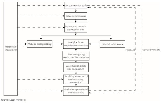 Marine ranching site selection and design are the first steps in marine ranching construction. The FAO pointed out that marine spatial planning (MSP) and ecosystem approaches are the two robust tools for BGI. The FAO has provided guidance on spatial planning to many countries, including aquaculture zoning and site selection from an ecosystem perspective []. MSP and ecosystem approaches have been widely used for marine spatial planning in the ECS when marine ranching occurs on common property, such as the sea or natural water bodies. In general, both the MSP and ecosystem approaches are not activity-specific; they depend on the specific objectives and elements of marine ranching mentioned above.