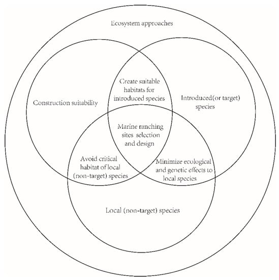 A conceptual diagram for the ecosystem approaches to marine ranching is shown in Figure 3 and the ecosystem approach to marine ranching has three objectives: (1) creating suitable habitats for the introduced (or target) species; (2) avoiding critical habitats of local (non-target) species; and (3) reducing competition between local (target) and introduced (non-target) species. Therefore, three key elements should be considered: (1) construction suitability, including functional zoning, basis of fisheries, planning, marine ecology environment, and infrastructure; (2) the introduced (or target) species, including seeds, breeding, domestication, release of introduced species, and the adaption of artificial habitats; and (3) local (non-target) species, including key habitats (spawning ground, nursery grounds, feeding grounds, overwinter grounds, and migration routes) of local species, and the adaption of local species to the artificial habitat. These approaches were applied in the Ma’an marine ranching pilot case [].