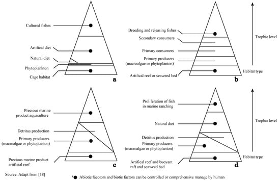 Typical marine ranching habitat construction mode in the ECS: (a) cage aquaculture mode, (b) traditional stock enhancement and releasing mode, (c) integrated multi-trophic aquaculture (IMTA) mode, and (d) multi-trophic and spatial based marine ranching mode [].