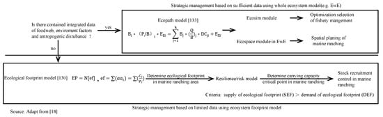 Strategic models, which focus on a broad scale assessment of directions and patterns of change, have been gaining recognition as robust tools for long-term management and planning of comprehensive benefit due to the combination of biological, ecological, economic, and social factors []. Strategic models can be used to simulate long-range or broadly-based trade-offs of different stakeholders and policy objectives. Many approaches have been applied to test marine ranching sustainability in China. For example, Shi et al. suggested the IMTA of kelps and scallops as the most sustainable culture model from the economic and ecological aspect, and used energy analysis to assess the ecological-economic benefits of monocultures and IMTA in the Sanggou Bay of China []. Zhao et al. successfully used the energy ecological footprint to compare and monitor the environmental impacts of fish farming in the ECS []. Xu et al. used the pressure–status–response model to evaluate the eutrophication levels in Xiang Shan Bay in the ECS []. Strategic management advice should be based on a combination of the different conceptual models. For example, Chao et al. proposed an integrated regional carrying capacity assessment indices system combined with a conceptual model of “driving force–pressure–state–response–control” (D-PSR-C) in the ECS for long-term sustainable development of the economy and ecology []. Sometimes different models can be used to answer the same strategy problem, and models providing strategic advice can be selected based upon the data, where a strategic model selection example was established by Zhang et al. (Figure 5) [].