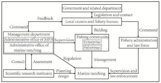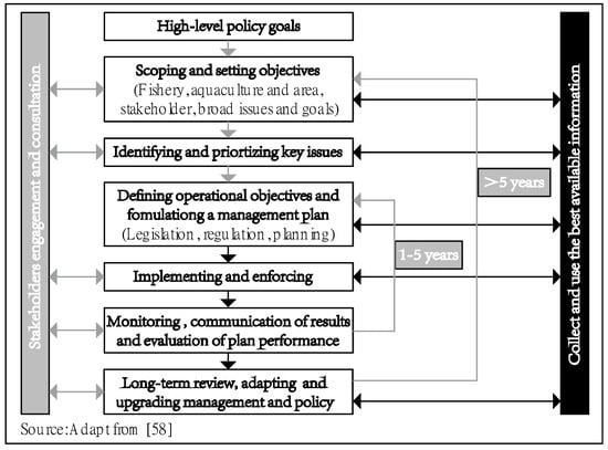 Much of marine ranching areas are used for more than one activity, especially in coastal and archipelago areas, which sustain many anthropogenic activities. For the marine ranching area to function well and sustainably, multiple activities and marine uses need to operate equitably and successfully with the various combination of users and uses. An example of cooperative management would be the multi-stakeholder co-uses example in the Ma’an marine ranching pilot in the ECS. The uses of the marine ranching pilots include commercial fishing, marine transportation, offshore mariculture, carbon sequestration sites, ports and anchorage, recreational fishing, scuba diving cables, pipelines, transmission lines, and scientific research. Therefore, administration in the Ma’an marine ranching pilot must coordinate the different uses and stakeholders, such as the separation of aquaculture structures from shipping lanes to avoid collisions, or the separation of artificial reefs from bottom trawling to avoid damage to the equipment. To achieve high-level policy goals, such as sustainability of harvestable resources and transformation of the traditional fishery industry as mentioned in the 13th Five-Year Plan, all stakeholders in the Ma’an marine ranching pilot have set up several management frameworks []. First, the process for the development of a management plan follows two principles: to collect and use the best available information and to have broader stakeholder engagement and consultation (Figure 6). Second, a regulatory system was created that combines government supervision and law-enforcement, involving stakeholder self-regulation, scientific internal communication, and control (Figure 7). Third, a tool and measures box was introduced to address the various challenges of managing the different components of marine ranching (Table 2). Together, these sets of frameworks provide the means to plan and manage marine ranching development that integrates it with broader stakeholders and considers the overall social, ecological, and economic benefits.