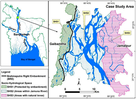 - Ferdous, M.R.; Wesselink, A.; Brandimarte, L.; Slager, K.; Zwarteveen, M.; Di Baldassarre, G. Socio-hydrological spaces in the Jamuna River floodplain in Bangladesh. Hydrol. Earth Syst. Sci. 2018, 22, 5159–5173. [Google Scholar] [CrossRef]