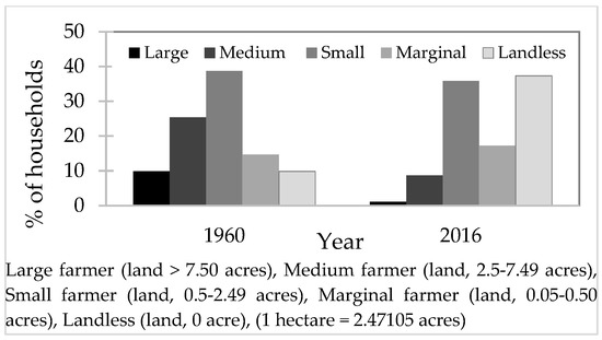 Table 1 seems to suggest that long-term economic trend in the area is upwards. Yet, agricultural farm sizes decreased in the study area since the 1960s (Figure 3). This is a potential sign of impoverishment. Figure 3 shows that the number of large farms decreased from 10% to only 1% during the period 1960s to 2016 and the number of landless households increased from 10% to about 37% during the same period.