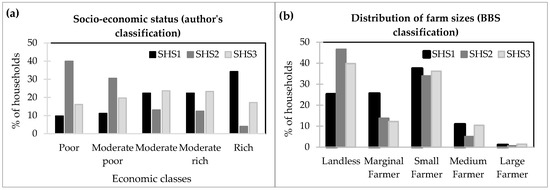 By comparing the current distribution of socio-economic classes in the three SHS, see Section 2.1 and Figure 1), one can see remarkable differences (Figure 4a). In SHS1, 10% of the households are poor and 35% are rich, while in SHS2 it is just opposite. SHS3 takes an intermediate position, with 15% poor households and 25% rich. Using the Government farm size classification for comparison (Figure 4b), it is observed that more than 35% of households are landless in the study area and only 1% of households are large (Figure 4b). Most of the landless farmers are found in the SHS2 as they are experiencing much more land erosion than SHS1 and SHS3.