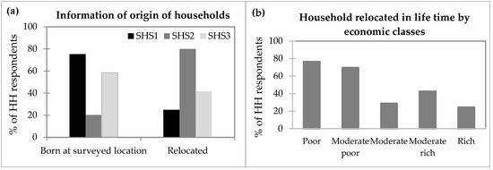 Relocation means to settle permanently in another place with the whole household. Households in the study area do not normally relocate due to flooding events. In case of severe flooding, some people may temporally evacuate over a short distance, to return to their houses after the flood. When households were asked about permanent relocation, many of them have expressed that “it is very hard to live here but we are born here, our forefather lived here then why should we leave?” They relocate permanently only when they face riverbank erosion. About 49% of households relocated during the entire period 1962–2016, and more than 95% of households claimed that riverbank erosion is the main reason of relocation. As expected, the maximum number of relocations occurred in the char areas, i.e., SHS2 (Figure 5a). By considering the socio-economic status, the maximum number of relocations occurred in poor (76%) and moderately poor (70%) households (Figure 5b). More than 90% of respondents relocated within 5 km from their previous locations and about 40% poor and 30% moderately poor households are considering relocating again because of riverbank erosion. A statistical analysis was performed and it was found that there exists a significant difference in relocation by the respondents between SHS and socio-economic groups (with α = 0.05).