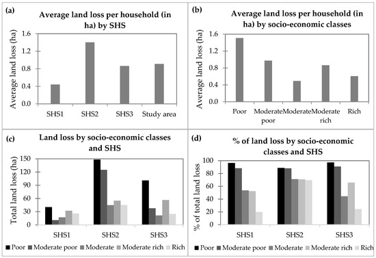 Total land loss by SHS and economic classes in the study area from 1962 to 2016. (a) Average land loss per household (in ha) by SHS; (b) Average land loss per household (in ha) by socio-economic classes; (c) Land loss by socio-economic classes and SHS; (d) % of land loss by socio-economic classes and SHS.