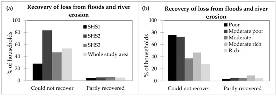 The respondents were asked about their recovery processes to explore how they recover from losses caused by consecutive events. “Flood and riverbank erosion have snatched everything from us, and we become destitute”, is one of the most commonly heard expressions in the char area (SHS2). People in the areas also like to ease their situation by believing that “Almighty Allah (God) has sent this flood towards us and so we have to accept it. This is our fate”. Most respondents informed us that it is almost impossible to recover from the riverbank erosion. About 53% of the respondents mentioned that they could not recover at all from the combined losses of flooding and riverbank erosion (Figure 8a). Only 5% of the households recovered a little but not enough to get back to their previous position. They recovered partially with hard working as agricultural laborer, other day laborer employment, and by selling properties or taking loans to do business, cattle farming, or send a household member to temporarily migrate to cities to earn some money. Also, more than 80% of the households in SHS2 could not recover at all, which is highest among the SHS. Looking at socio-economic classes, one can see that more than 70% of poor and moderately poor households could not recover at all (Figure 8b). A statistical analysis was performed and it showed that there is no significant difference in recovery from loss by the respondents between the SHS but there exists a significant difference in recovery of loss by socio-economic groups (with α = 0.05).