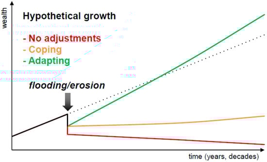 Coping or adapting? Deviation from a hypothetical trajectory of socio-economic growth (black line) caused by flooding and erosion, in case of: (i) no adjustments (red line), (ii) coping (orange line), and (iii) adapting (green line).