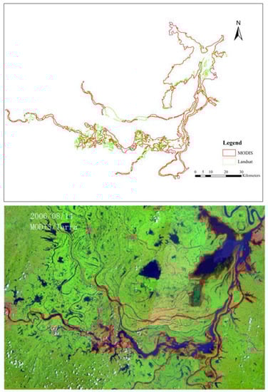 Comparison of water area boundary extracted by MODIS and Landsat in the same period.