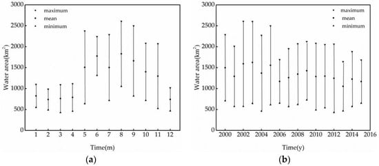 Through applying the MODIS imagery obtained from 2000 to 2015, we obtained multi-temporal areas of the Dongting Lake. As shown in Figure 3 and Figure 4, we found that the area changes of the Dongting Lake fluctuated greatly from 2000 to 2015. The maximum water area during the year generally occurred during July and September. The minimum water area value during the year generally occurred from January to March and from October to December, which was largely consistent with the distribution pattern of the water levels during the year. Figure 3a shows the distribution of the monthly maximum, minimum, and average water area of Dongting Lake from 2000 to 2015. From January to April and in December, the difference between the maximum and minimum values was small. The difference was large from May to October. The minimum intra-annual variation was in January, and the maximum intra-annual variation was in May.