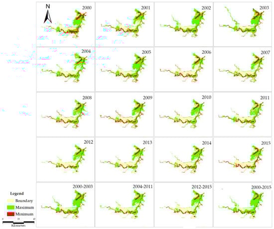 Annual maximum and minimum water area of Dongting Lake in 2000–2015.