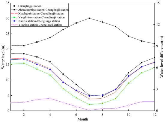 There was a large upstream and downstream difference in the water levels of the Dongting Lake area. Figure 5 shows the changes in water level differences (water level at the stations of the lake minus the water level at Chenglingji station). The variation in water level difference was consistent across all stations. The water level difference was relatively small in the high-flow period and relatively large in the low-flow period. Take the Zhouwenmiao station as an example, from January to March, April to June, July to September, and October to December, the water level difference was 7.80 m, 5.20 m, 2.39 m, and 6.47 m, respectively. These results are consistent with the changes in the water level across hydrological seasons.