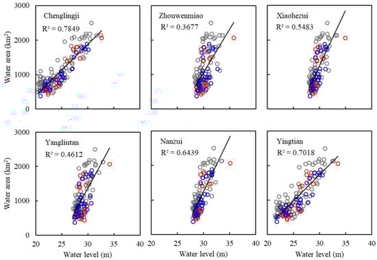 Due to the impact of the TGR built in 2003, the water levels of Dongting Lake have changed significantly. In this research, we only analyzed the data after 2004. Scatter plots of water levels and water areas (Figure 6) indicate that the water level and water area of Chenglingji station tended to be linearly correlated, and the correlation coefficients was greater than those for other stations. The scatter points of water level–water area at the Zhouwenmiao and Yangliutan stations had a high dispersion, with correlation coefficients less than 0.5.